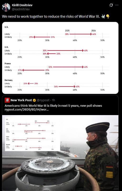 Π Π½Π΅ΠΉ ΠΏΡΠΈΠ²ΠΎΠ΄ΡΡΡΡ ΡΠ΅Π·ΡΠ»ΡΡΠ°ΡΡ ΠΎΠΏΡΠΎΡΠ° ΠΆΠΈΡΠ΅Π»Π΅ΠΉ ΠΠ΅Π»ΠΈΠΊΠΎΠ±ΡΠΈΡΠ°Π½ΠΈΠΈ, ΠΠ΅ΡΠΌΠ°Π½ΠΈΠΈ, Π‘Π¨Π ΠΈ Π€ΡΠ°Π½ΡΠΈΠΈ, ΠΊΠΎΡΠΎΡΡΠ΅ ΡΡΠΈΡΠ°ΡΡ, ΡΡΠΎ Π’ΡΠ΅ΡΡΡ ΠΌΠΈΡΠΎΠ²Π°Ρ Π²ΠΎΠΉΠ½Π° ΠΌΠΎΠΆΠ΅Ρ Π½Π°ΡΠ°ΡΡΡΡ Π² Π±Π»ΠΈΠΆΠ°ΠΉΡΠΈΠ΅ 5 Π»Π΅Ρ. Π‘Π°Π»ΡΠ½ΠΎΠ΅ ΠΠΈΡΠ»ΠΎΠΏΡ