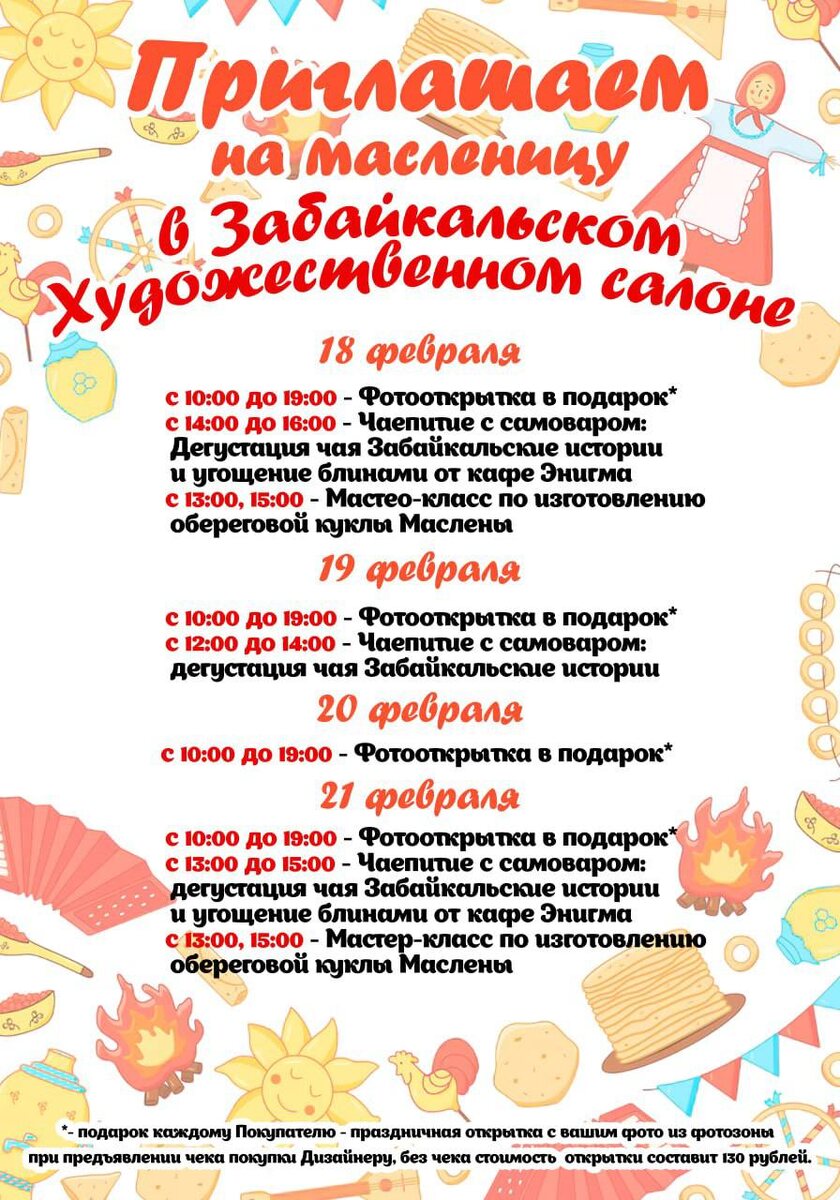 Забайкальский художественный салон приглашает на разгуляй Гостей ждет чаепитие с самоваром и тематические мастер-классы. В салоне создана фотозона в стиле тренда «А-ля рус» и на ее фоне можно утроить фотосет. Все подробности – в афише 🕐18, 19, 20 и 21 февраля 📍Забайкальский художественный салон, ул. Ленина, 56 #Новости Предложить публикацию:@zabkulisye_bot