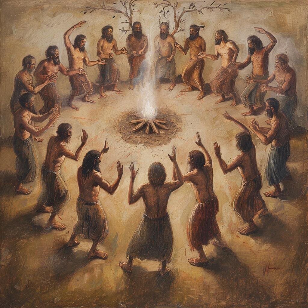 Таким образом, речь родилась не в тишине размышлений, а в гуле костра, ритме барабанов и танце вокруг огня.