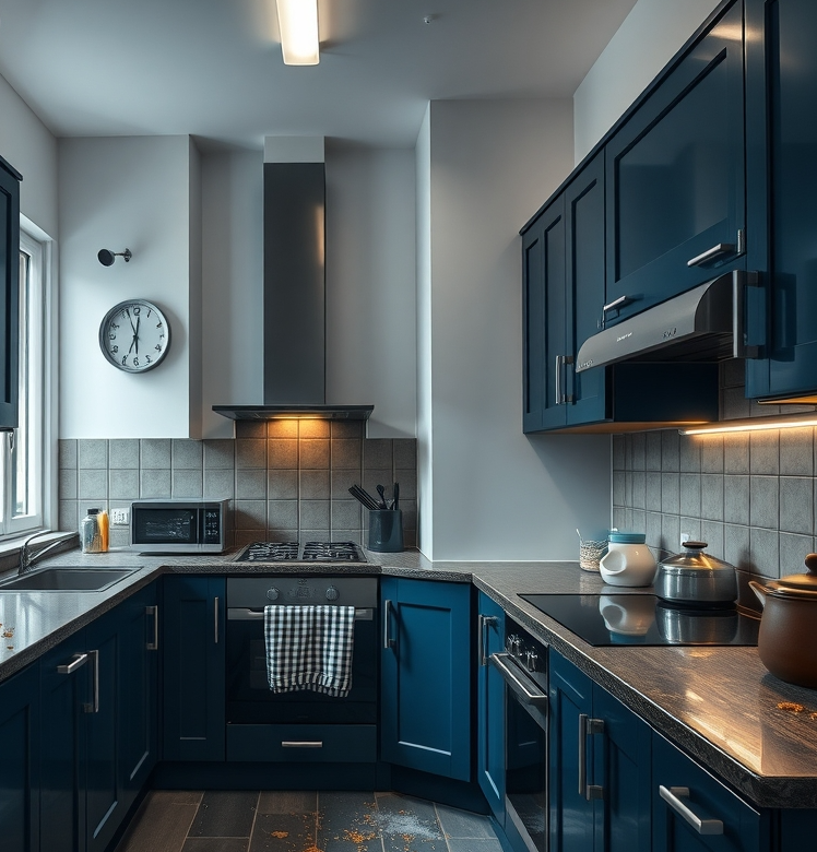 Темно-синяя кухня часто отпугивает потенциальных владельцев из-за хитрых визуальных иллюзий, которые проявляются особенно ярко в реальных условиях: в малогабаритной квартире площадью меньше десяти квадратных метров синие фасады шкафов и стен словно сжимают пространство, заставляя потолок давить сверху, а стены надвигаться, особенно вечером, когда искусственный свет едва разгоняет тени, создавая ощущение клаустрофобии. Представьте себе повседневную картину: вы открываете дверцу шкафчика, чтобы достать специи, и сразу замечаете скопившуюся пыль, крошки от вчерашней выпечки или случайные капли жира — на тёмном фоне они вспыхивают как неоновые пятна, подчёркивая малейший беспорядок и заставляя тратить уйму времени на уборку, вместо того чтобы наслаждаться процессом. Ещё одна коварная засада кроется в психологических ассоциациях: глубокий синий вызывает мысли об офисном пространстве или стерильной морской палубе, а не о домашнем уюте, и это особенно заметно в типичных российских квартирах с их скромными окнами и северной ориентацией.