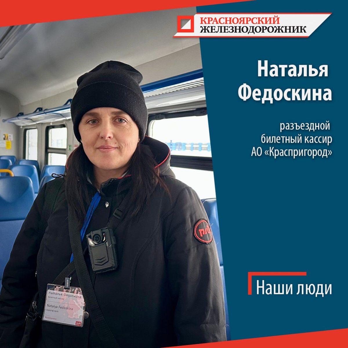 билетный кассир Наталья Федоскина. 🚇 Она работает в основном на маршрутах городской электрички, но бывают и дальние поездки до Маны, Иланской и Красной Сопки. Наталья признаётся: ей нравится работа в движении, а ещё больше – когда людям комфортно в пути следования. 🤝 Этой зимой пассажиры благодарили её за тёплые во всех отношениях поездки. 🗞🗞🗞🗞🗞🗞 #ГодПассажира 📱 ВК | ТГ | Cайт