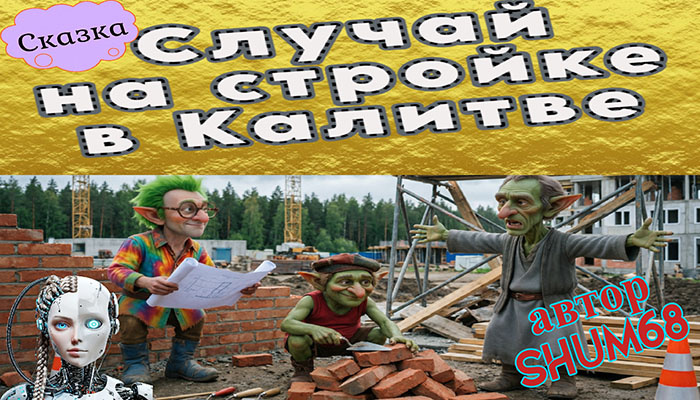 В болотном городишке Калитве, где небо никак не решает — дождь или снег, а воздух густ от сырости и тумана, трое гоблинов-строителей строят самый кривой дом в истории. Яков Щука, лысый фантазёр с зелёным хохолком и круглыми очками, укладывает кирпичи по вдохновению, превращая стены в «поющие арки». Фунтик, толстяк в красной футболке и тюбетейке, месит и заливает бетон, сетуя на непослушную погоду. Мокряк, высокий и худой в сером халате, молча вплетает арматуру, спасая стройку от обрушения. Им помогают необычные рабочие: огромные пауки-монтажники сплетают косые арки, а болотные комары-отделочники полируют стены блестящей слизью. Зрители-гоблины на велосипедах с восторгом наблюдают, как окна дома выходят не на улицу, а на собственные стены — «философия в кирпиче», по словам Якова. Когда небо наконец решается на снег с дождём внутри хлопьев, дом готов: кривой, косой, неправильный — но живой. Башенные часы с кукушкой, преодолев плесень, кукуют полночь. И трое друзей понимают: прямой дом мо
