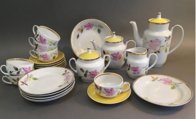 А теперь смотрим на пример полного сервиза, молочник из которого сегодня в центре внимания. О, какие прекрасные жёлтые блюдечки и крышечки! Хочу-хочу-хочу 😄 Такое сплошное крытье отдельных предметов - фирменный стиль Рижского фз. Причем на основном рисунке желтый цвет есть, но только намеком. А вот блюдца и крышки - уже по полной! Нравится ☺️