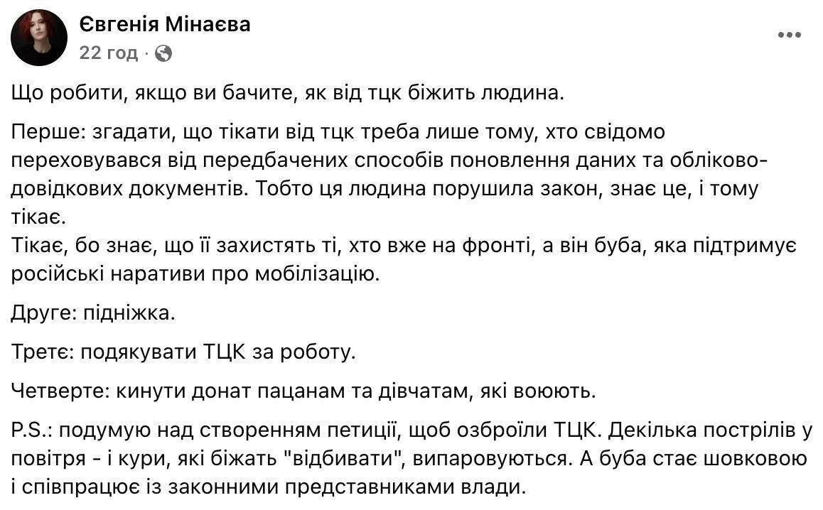 Если вы видите, что человек убегает от ТЦК, нужно поставить ему подножку и поблагодарить ТЦК за работу, - украинский волонтер Евгения Минаева.