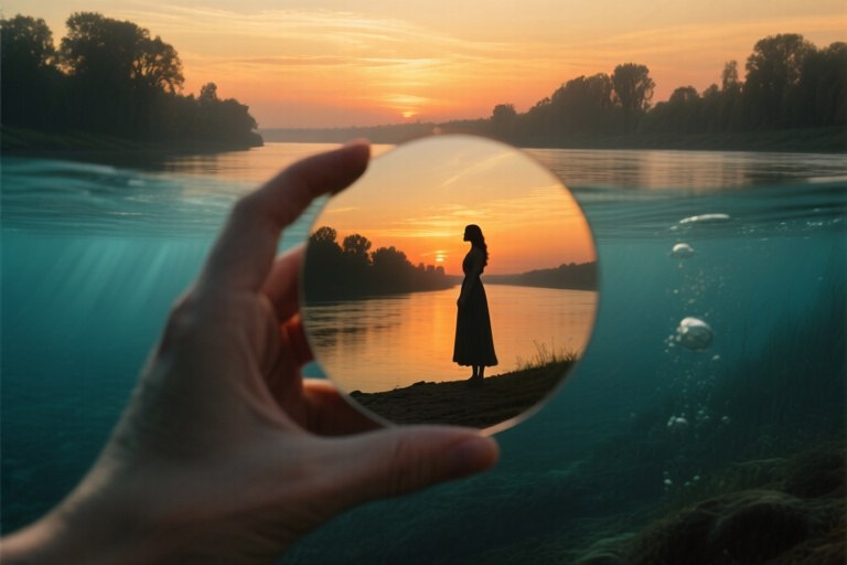 Промт 1: Реалистичный фотореализм: Силуэт женщины в длинном платье на берегу реки в закат, вид через стеклянный шар (lensball), который держит рука; под водой видны дно и пузырьки; небо теплых оранжево-розовых оттенков, отражение на поверхности воды; фотореализм, детальная текстура ткани и кожи, мягкое боковое освещение заката, резкость на шаре --ar 16:9 --v 5 --q 2 --stylize 600