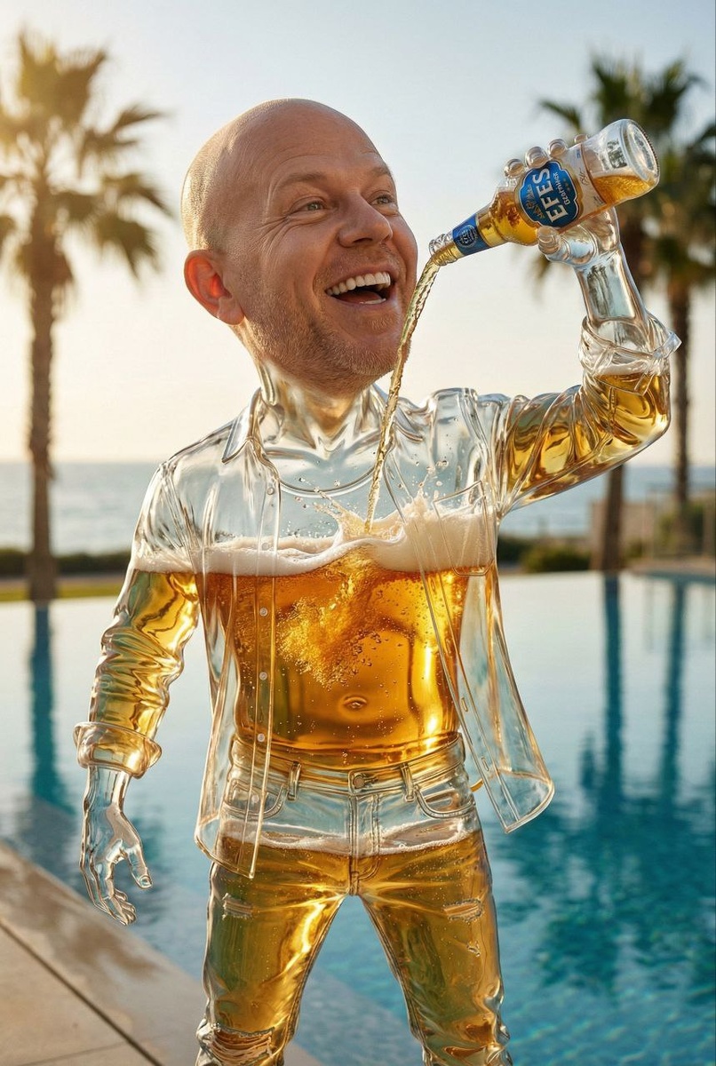 efes. Его голова слишком большая и выразительная, как у карикатуры, с широкой улыбкой и восторженными глазами, в то время как все его тело сделано из прозрачного стекла, наполовину заполненного плещущейся внутри водой цвета пива с пузыриками. Видно, как вода попадает ему в рот и струится по прозрачному телу, создавая динамичные пузырьки и движения. На нем прозрачная одежда, похожая на стекло, из того же материала. Теплое кинематографическое освещение кухни, малая глубина резкости, ультрадетализированные текстуры, высокая контрастность, реализм 8k, стиль коммерческой фотографии, центрированная композиция, вертикальный кадр, внешний вид рекламы в социальных сетях, четкий фокус, эффектные отражения и преломления в стеклянном корпусе ➡️ Генерируем ТУТ 💵 Отблагодарить