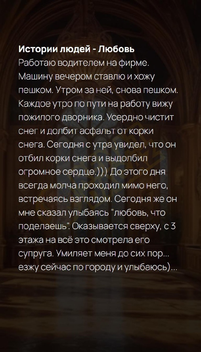 Истории людей - Любовь Работаю водителем на фирме. Машину вечером ставлю и хожу пешком. Утром за ней, снова пешком. Каждое утро по пути на работу вижу пожилого дворника. Усердно чистит снег и долбит асфальт от корки снега. Сегодня с утра увидел, что он отбил корки снега и выдолбил огромное сердце.))) До этого дня всегда молча проходил мимо него, встречаясь взглядом. Сегодня же он мне сказал улыбаясь "любовь, что поделаешь". Оказывается сверху, с 3 этажа на всё это смотрела его супруга. Умиляет меня до сих пор... езжу сейчас по городу и улыбаюсь)... #взаимовыручка2026 #доброеутро #душевно #добрыедела #призвание #позитив #популярное #жизненныйпуть #отношения #взаимовыручка2026 #доброеутро #душевно #добрыедела #призвание #позитив #популярное #жизненныйпуть #отношения Натальная карта | Ваш Ангел и Демон T | VK | Pin | YouTub | Dzen Истории людей - Любовь Работаю водителем на фирме. Машин… #15число #15февраля