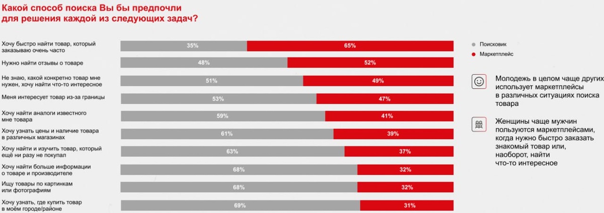 Вышло исследование компании "Ашманов и партнеры" по поведению при поиске товаров на маркетплейсах. Думаю, многим стоит взять на заметку. 71% онлайн-покупателей ответили, что часто ищут товары на маркетплейсах. Для сравнения поиск в обычных интернет магазинах часто иcпользуют почти втрое меньше респондентов ― 26% (ФГ: мы бы сказали - не так мало!). Маркетплейсы используют почти также часто как и поисковые для поиска товаров, причем 28% покупателей предпочитают маркетплейсы другим способам поиска. Считается, что маркетплейсы привлекательны из-за удобства: широкого ассортимента, быстрой доставки, легкого возврата и тд. Вероятно, эти факторы играют роль при принятии решения о покупке, но в момент поиска для большинства покупателей важнее всего наличие скидок и отзывов. Маркетплейс ― это не столько быстрый способ найти нужный товар, сколько способ найти его дешевле и это во многом определяет их высокую востребованность в качестве инструмента для поиска. Если в поисковых системах покупат