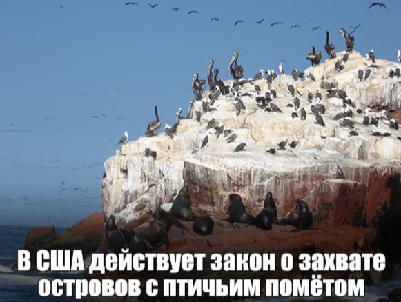 В 1856 году Конгресс США принял Акт о гуано (Guano Islands Act). Это, пожалуй, один из самых экспансионистских законов в истории: любой гражданин США, обнаруживший залежи гуано на необитаемом острове, не принадлежащем другому государству, имел право забрать его себе. Более того, остров автоматически становился владением Соединенных Штатов.