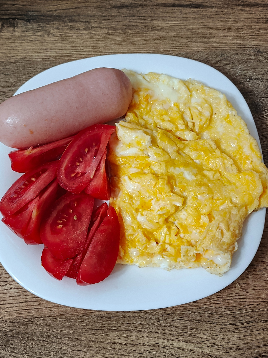 Утро начинается с простых радостей, и завтрак — одна из них. Сегодня на столе — простой, но очень вкусный набор: яичница-болтушка, сочная сарделька и свежий помидор.