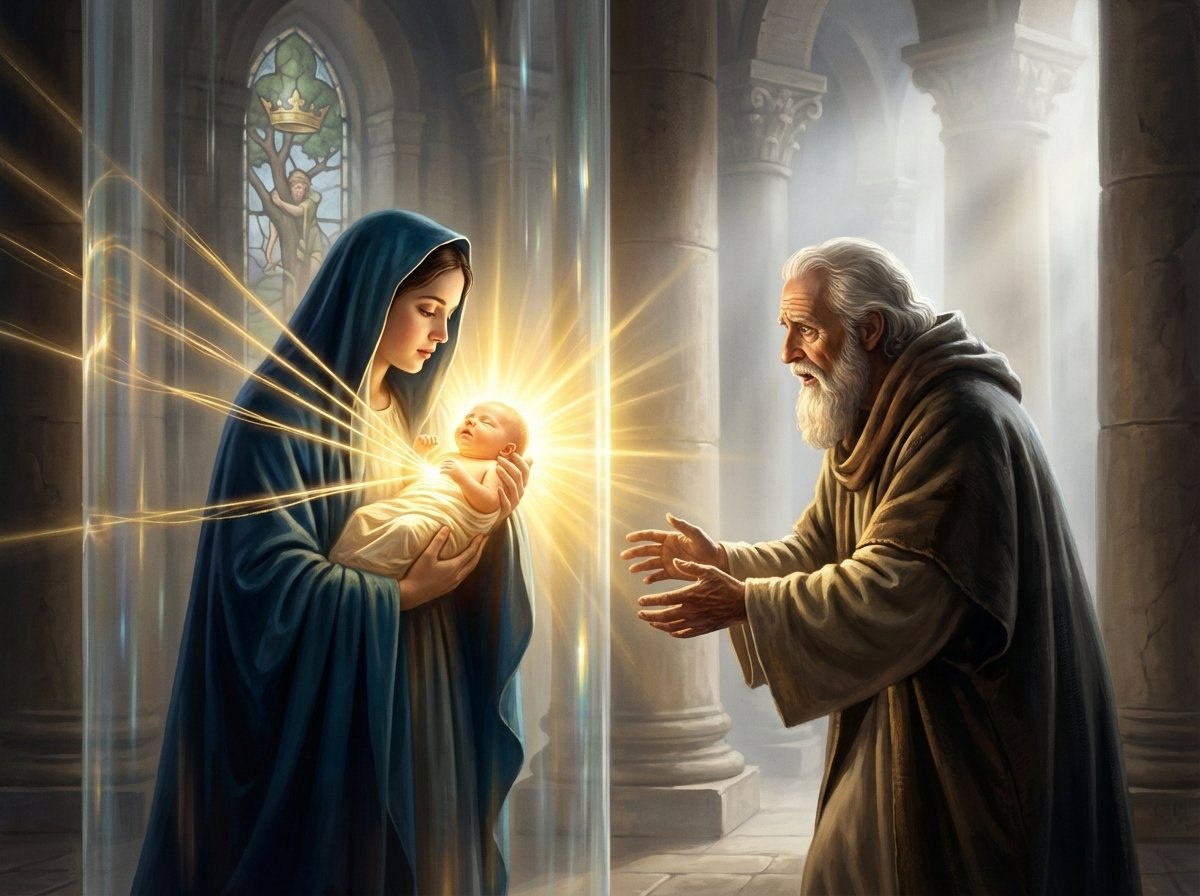 Сретение — событие, в котором впервые после грехопадения явлена полнота единства твари и Творца без малейшего искажения. В чуме каждый умирает в одиночку, в Сретении — Мать и Сын, старец и Младенец, Ветхий и Новый Завет встречаются в едином пространстве храма. Чума — следствие греха Адама, разорвавшего единство; Сретение — начало восстановления этого единства во Христе. Младенец, принесенный в храм, есть Сам Бог; Матерь, принесшая Его, есть чистый человек; и между Ними нет той стены, которую воздвигает грех. Их природа — едина. Их чувствования — одни. Их боль — одна.