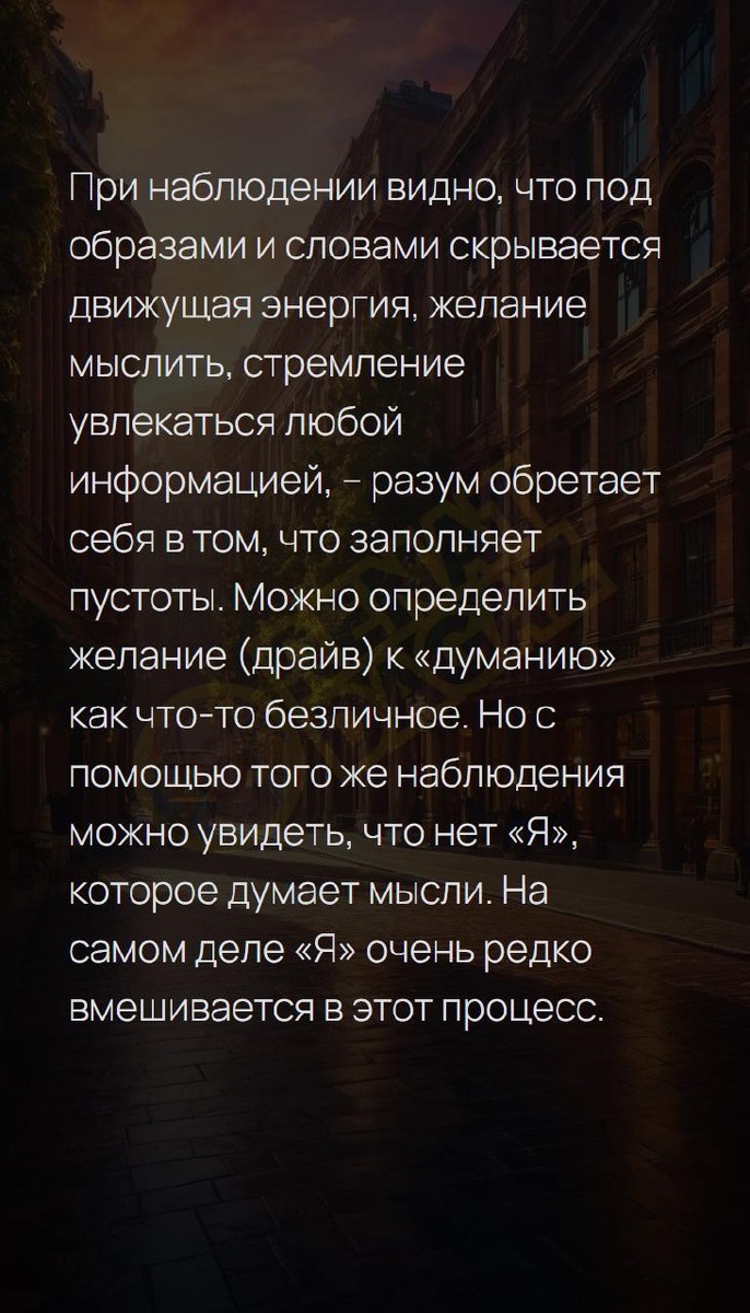 ✨ При наблюдении видно, что под образами и словами скрывается движущая энергия, желание мыслить, стремление увлекаться любой информацией, – разум обретает себя в том, что заполняет пустоты. Можно определить желание (драйв) к «думанию» как что-то безличное. Но с помощью того же наблюдения можно увидеть, что нет «Я», которое думает мысли. На самом деле «Я» очень редко вмешивается в этот процесс. Архитектура вашей души | Архитектура вашей души T | VK | Pin | YouTub | Dzen #впотоке #мотивациякаждыйдень #внутренниймир #путьксебе #вибрациидуши #сценарийжизни #энергообмен #благодарностьвселенной #женскаяэнергия #15число #15февраля