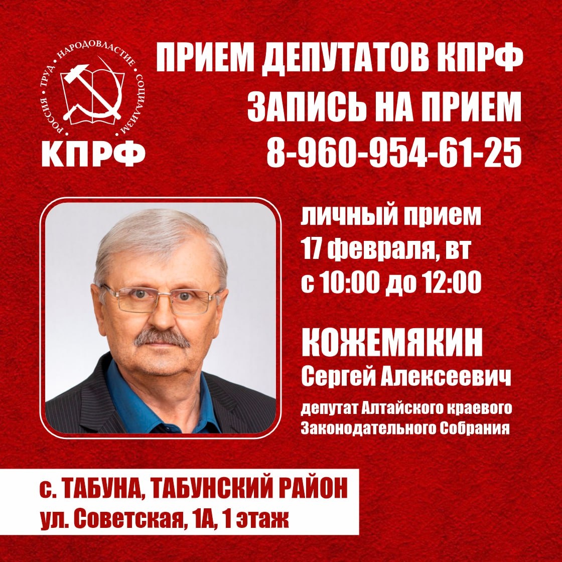 : ЛИЧНЫЙ ПРИЕМ КОЖЕМЯКИН С.А., депутат АКЗС 📌17 февраля, вт, 10:00 – 12:00, с. Табуны, Табунский район, ул. Советская, 1А, 1 этаж. ☎️ Запись на прием по тел. 8-960-954-61-25