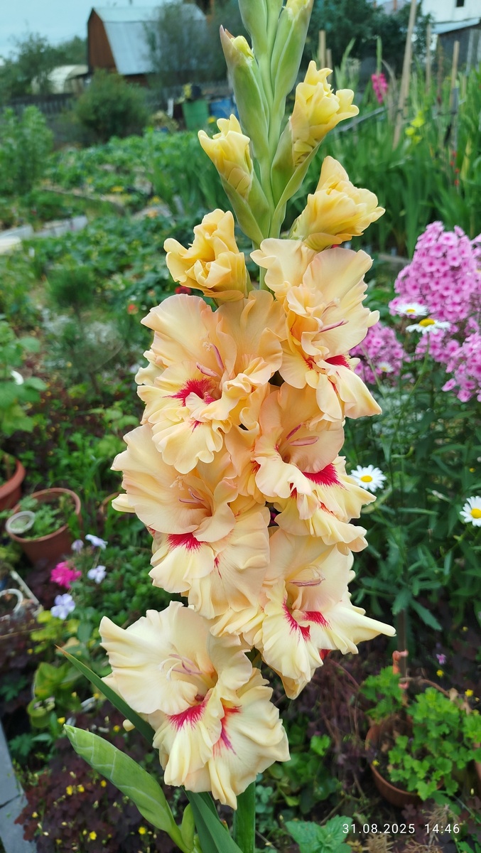 523-С-1997-СГ Громов Нежно-оранжевый с персиково-абрикосовыми тонами. На нижнем лепестке небольшое вишнёвое пятнышко. Прочная шелковисто-восковая фактура лепестков, волнистая крупная гофрировка глубокими защипами. Идеально двухрядный, прекрасно сложён. Мощный. Держит до 12 открытых цветков. Блестящий красавец.