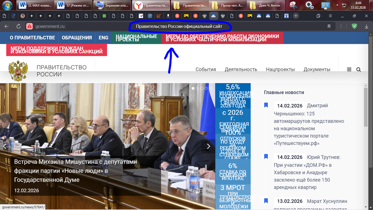 Есть доступ на земле через World Wide Web (аббревиатура WWW (Всемирная Компьютерная Сеть) в информационно-телекоммуникационную сеть Internet («Интернет») и через соответствующую поисковую систему (браузер) на страницы сайтов по адресам URL. Есть Правительство России официальный сайт по URL: http://government.ru/ Фотографию от 15.02.2026 г. Правительство России официальный сайт прилагаю следующую. Еще далее есть графическое изображение символа и слова ПРАВИТЕЛЬСТВО РОССИЙСКОЙ ФЕДЕРАЦИИ по URL: http://government.ru/static/img/logo_gov_dark.svg Фотографию от 15.02.2026 г. сайта графическое изображение символа и слов прилагаю следующую. Более того есть графическое изображение символа и слова по URL: https://руни.рф/Файл:Government.ru_logo.svg Фотографию от 15.02.2026 г. сайта графическое изображение символа и слов прилагаю следующую. Есть символы (знаки) следующие: 1) Государственный флаг Российской Федерации является официальным государственным символом Российской Федерации; 2) Государ