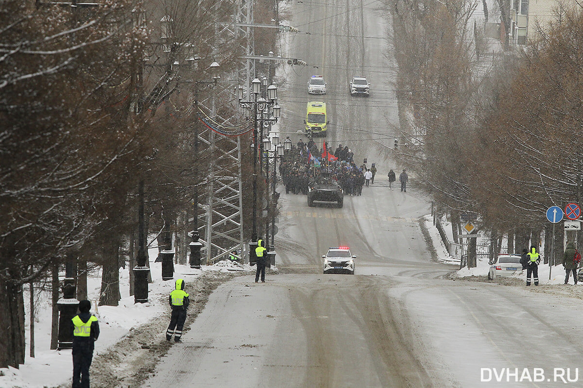 Сегодня в Хабаровске состоялось мероприятие посвященное Дню памяти о россиянах, исполнявших служебный долг за пределами Отечества. По улице Тургенева от Комсомольской площади до мемориального комплекса на площади Славы проследовали ветераны боевых действий, родственники погибших военнослужащих, а также неравнодушные жители города. В связи с проведением мероприятия было временно ограничено движение всех видов транспорта по улицам Тургенева, Шевченко, Муравьева-Амурского от улицы Шевченко до улицы Тургенева. Шествие по традиции возглавлял БТР. На нем были размещены динамики, из которых звучали военные песни. Участие в мероприятии приняло около ста человек. На площади Славы участники шествия почтили память воинов-интернационалистов минутой молчания и возложили цветы к мемориалу. Напомним, что более чем на месяц перекрыли улицу Шкотова. Перекрытие затронуло участок от пересечения с Приморской до торгового центра Rich Family. Причиной стали работы по строительству новой теплотрассы. Улицу п