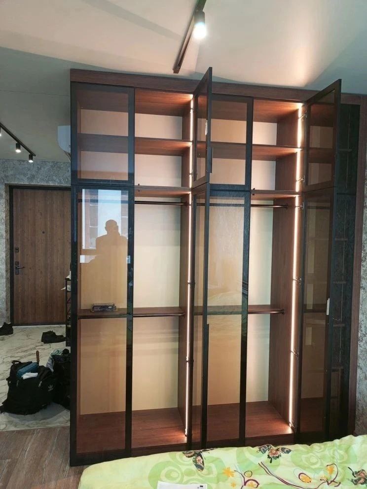 ! ✨ Представляем Вашему вниманию потрясающий проект, где функциональность встречается с безупречным стилем. Дымчатое матовое стекло — будто застывший туман, хранящий секреты Распашные двери с бесшумным механизмом — открываются легко, как по волшебству Благородные оттенки дерева — тёплый контраст к прохладному стеклу Изящные ручки — не просто деталь, а акцентный штрих Гардеробная зона с продуманной системой вешалок и штанг Выдвижные ящики нижнего яруса — плавный ход, максимальная вместительность LED-подсветка с мягким тёплым светом — больше никаких поисков вещей в темноте 💡 Фишки, которые Вы полюбите: Защита от хаоса: всё скрыто за дверцами — никакой визуальной перегрузки Игра света: матовое стекло мягко рассеивает лучи, создавая уютную атмосферу Эргономика до мелочей: каждый сантиметр пространства работает на Вас 🎁 А теперь представьте, как приятно будет проводить рукой по гладкой поверхности стекла, открывать двери без усилий и находить всё на своих местах… Готовы во