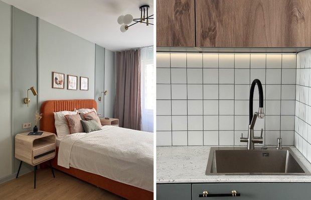 Над изголовьем кровати повесили картины, которые художница Лилия Крылова написала специально для этого интерьера в нужных цветах — зеленом и оранжевом. Заказ у художника позволил получить декор, который идеально вписывается в цветовую гамму и поддерживает концепцию. Это альтернатива покупке готовых постеров или картин, которые не всегда подходят по оттенкам.