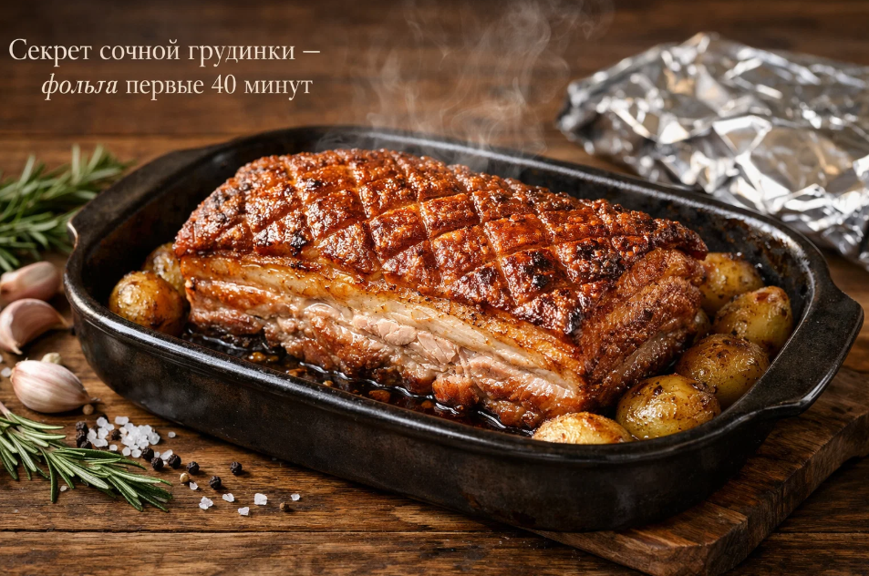 Когда речь заходит о приготовлении мяса в духовке, многие хозяйки сталкиваются с одной и той же проблемой — как сделать так, чтобы кусок получился мягким и сочным, а не сухим и жёстким. Особенно это касается свиной грудинки, которая при неправильном подходе может разочаровать даже опытного кулинара. Я потратила немало времени на эксперименты, прежде чем нашла тот самый способ, который работает безотказно. И главный секрет оказался до смешного простым — нужно накрыть мясо фольгой на первые сорок минут запекания.