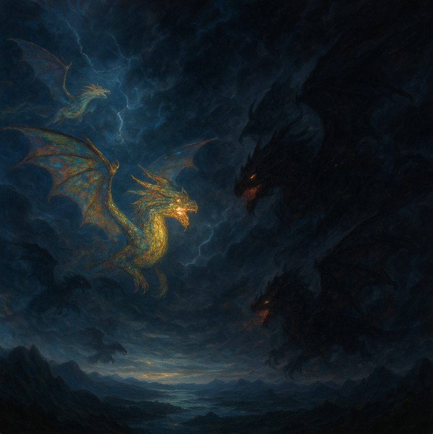 В небесах, где бушуют грозы и сверкают молнии, парят драконы, порождения огня и гроз. Их чешуя переливается всеми цветами радуги, а глаза горят, словно пламя в ночи.
