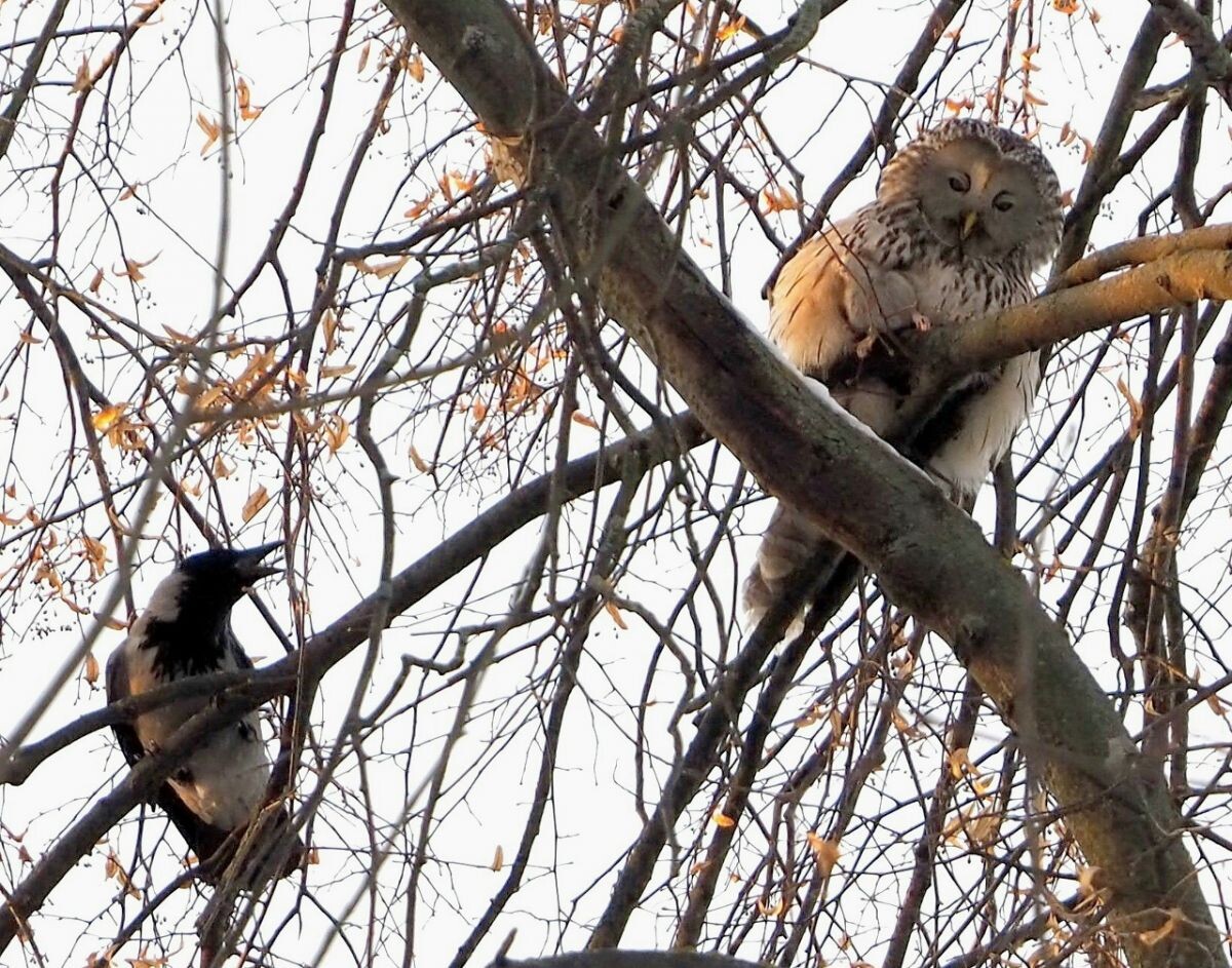 Жительница Рязани по пути на работу обратила внимание на возбуждённое карканье ворон. Лишь вечером она поняла причину шума: на дереве всё ещё сидела длиннохвостая неясыть, держа в когтях пойманную крысу. Хищная птица, вероятно, охотилась у мусорных баков, где грызуны — частые гости. Весь день неясыть спокойно сидела на ветке, не торопясь есть добычу, чем сводила с ума стаю ворон. Историю опубликовали в паблике "Рязанский клуб Птицы".