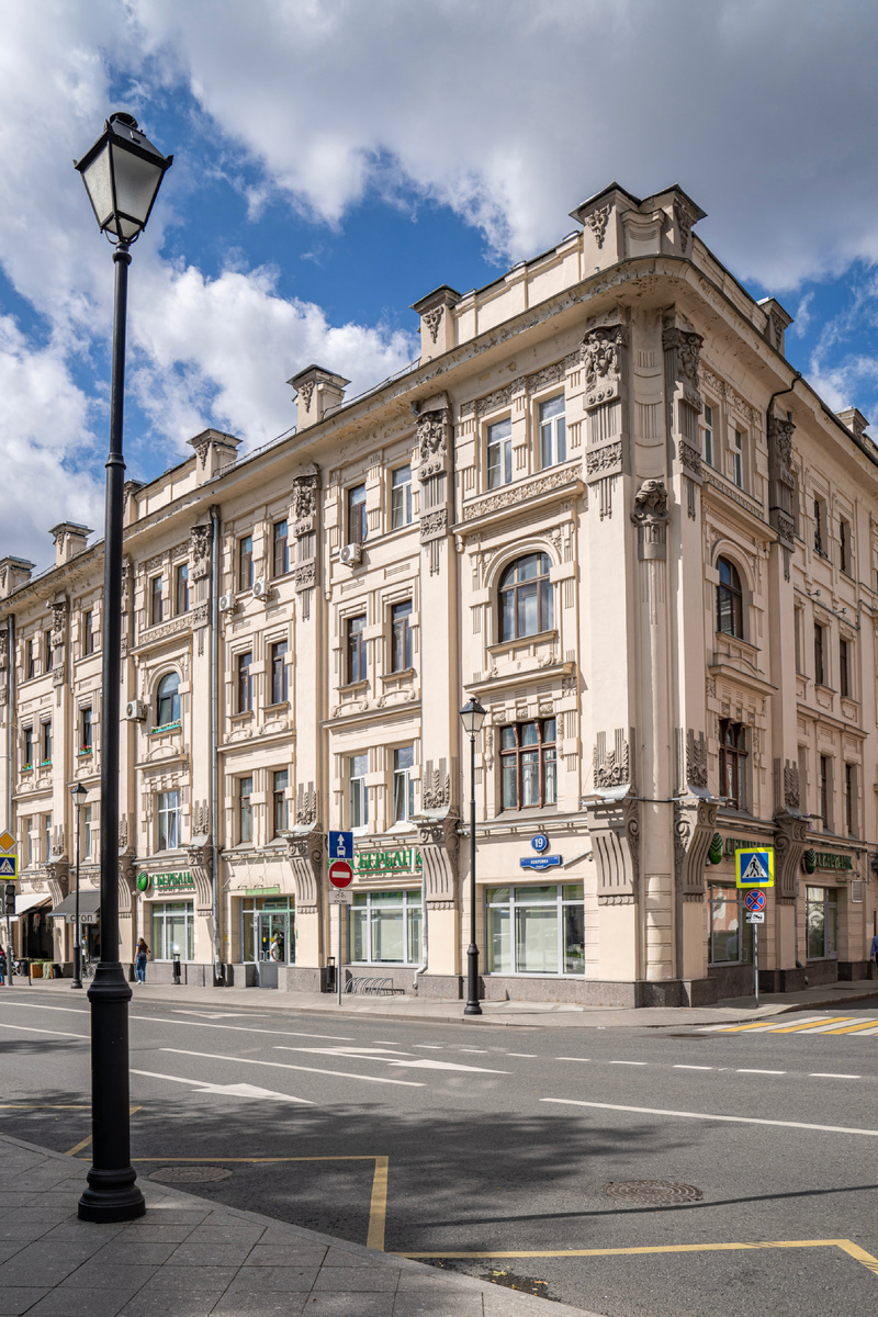 Перед вами доходный дом Рахманова. Он окружен улицами со всех сторон и представляет собой маленький квартал в стиле модерн в большом городе.