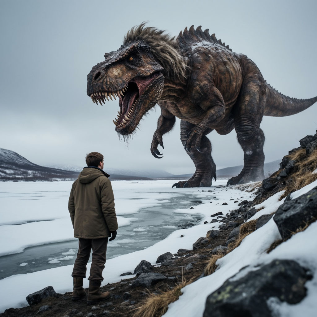 В 1968 году экспедиция геологов отправилась на Чукотку — искать месторождения цветных металлов в районе, который на картах значился как «малоизученный». Группа из пяти человек продвигалась по тундре, отмечая образцы пород, пока внезапный туман не разделил их. Старший геолог Иван Петрович и двое помощников ушли вперёд, а молодой специалист Андрей Морозов отстал, пытаясь задокументировать необычную породу с вкраплениями фиолетового минерала. Когда туман рассеялся, Андрей понял, что заблудился. Горизонт тонул в серо‑жёлтой дымке, компас барахлил, а следы группы исчезли. Он шёл наугад, пока не услышал низкий, вибрирующий рёв — такой глубокий, что задрожала земля под ногами. Звук доносился откуда‑то с холмов, и в тот же миг Андрей увидел его. По склону, ломая ледяные наросты, спускалось существо, напоминавшее тираннозавра, но покрытое густой бурой шерстью. Его массивные лапы оставляли глубокие следы в мёрзлой земле, а пасть с кривыми жёлтыми клыками была приоткрыта, обнажая ряды острых зубо