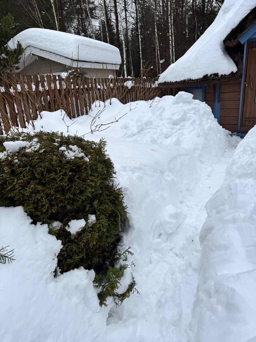 Я давно не разрешаю ничего трогать зимой, но кроме туй, которые можно отряхнуть без потерь.