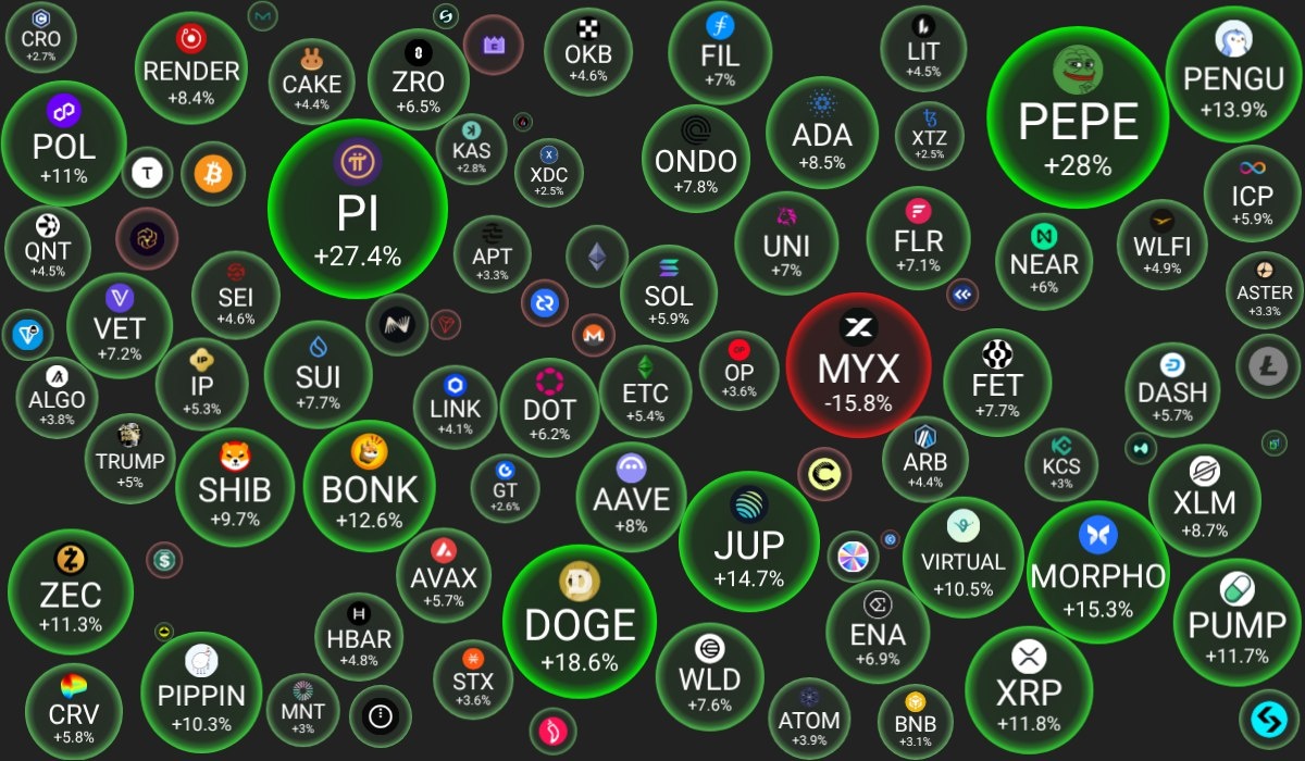 🗓 15.02.2026 09:30 по Москве. 🔗 Посмотреть на сайте 📈 Лидеры роста (из ТОП-100): 🟢 Pepe (PEPE): $0.0000 (+28.1%) 🟢 Pi Network (PI): $0.1921 (+27.5%) 🟢 Dogecoin (DOGE): $0.1147 (+18.8%) 📉 Лидеры падения (из ТОП-100): 🔴 MYX Finance (MYX): $2.1117 (-15.7%) 🔴 LEO Token (LEO): $8.4136 (-2%) 🔴 Canton Network (CC): $0.1628 (-1.9%) 🔍 Основные метрики: 🟢 Общая капитализация: $2421.10 млрд (+2.72%) 🟢 Общий объем торгов: $98.70 млрд (+10.41%) 🔴 Доминация Bitcoin: 58.15% (-0.23%) 🔴 Доминация Ethereum: 10.43% (-0.08%) 🔴 Индекс страха и жадности: 8 / 100: ЭКСТРЕМАЛЬНЫЙ СТРАХ (-1) 🟢 Индекс Альтсезона: 36 / 100: НЕ АЛЬТКОИН-СЕЗОН (+6) 📖 Интересно почитать: 👉 Hyperliquidity Provider (HLP) - зарабатывай на ошибках трейдеров 😻 Наши сервисы и бонусы: 💰 Cryptoage.com - рассказываем про Блокчейн и Криптовалюты с 2013 года 📈 MEXC - 20% скидка на комиссии. На бирже MEXC самые низкие комиссии для торговли, иногда бывают акции с нулевой комиссией.