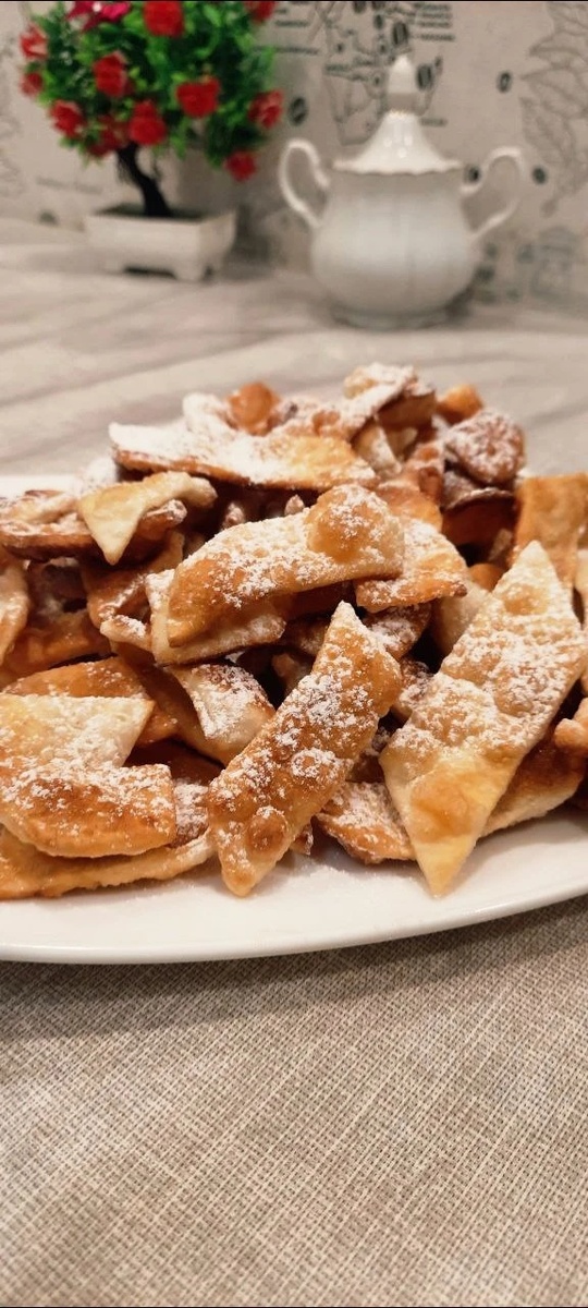 В кастрюлю налить много растительного масла и хорошо нагреть, важно чтоб хворост сразу поднимался. Обжаривать небольшими порциями.готовые изделия выложить на бумажную салфетку, после того как остынут, посыпать пудрой.