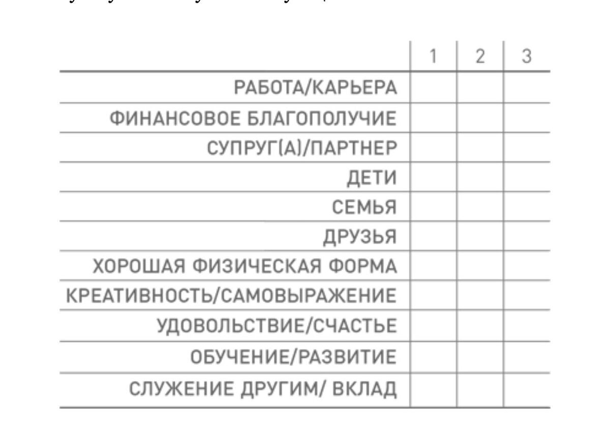 ! Что такое счастливая и благополучная жизнь. В графе 1 оцените степень важности каждого из перечисленных ниже аспектов вашей жизни по шкале от 1 до 10, где 1 — низший показатель, а 10 —«высший. Это не принудительный рейтинг, поэтому вы можете смело выставлять самые высокие или самые низкие оценки. В графе 2 укажите, сколько энергии вы тратите на каждый аспект вашей жизни, используя ту же самую шкалу оценки. «И наконец, в графу 3 впишите числа, полученные при вычитании числа в графе 2 из числа в графе 1. Возможно, вы получите несколько отрицательных результатов, и это нормально. Если вы не знаете, что ответить, постарайтесь представить, что бы сказали по этому поводу хорошо знающие вас люди или просто спросите их мнение. Графа 1 есть отражение ваших ценностей — того, к чему вы стремитесь. Графа 2 отражает действительность. Графа 3 определяет степень разрыва между первым и вторым. Очевидно, что идеальным результатом, внесенным в графу 3, будет ноль. Это означает, «что в люб