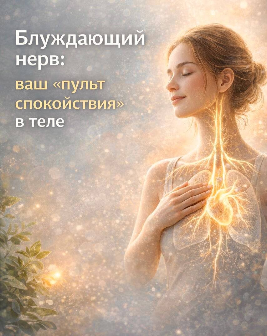 🌿 Иногда кажется, что тревога появляется из ниоткуда, сердце бьётся чаще, дыхание поверхностное, живот реагирует, сон становится ломким. И в такие моменты очень полезно знать: в нашем организме есть система, которая буквально умеет переключать нас из режима «выживания» в режим «восстановления». Один из ключевых проводников этой системы — блуждающий нерв. Что такое блуждающий нерв Блуждающий нерв (vagus nerve) — самый длинный из черепных нервов. Он начинается в области мозга и проходит вниз через шею к сердцу, лёгким, желудку, кишечнику и другим органам. Поэтому и называется «блуждающим» — он как бы соединяет мозг и тело единой линией связи. Зачем он нужен Главная роль блуждающего нерва — управление парасимпатической нервной системой, то есть режимом: • спокойствия • переваривания пищи • восстановления • глубокого сна • нормализации сердечного ритма • баланса дыхания • здоровой работы ЖКТ Когда блуждающий нерв активен и находится в тонусе, телу легче: • успокаиваться после стрес