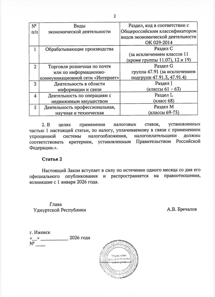 Сейчас по многим чатам распространяется Проект закона Правительства УР о льготных ставках по УСН на 2026 г