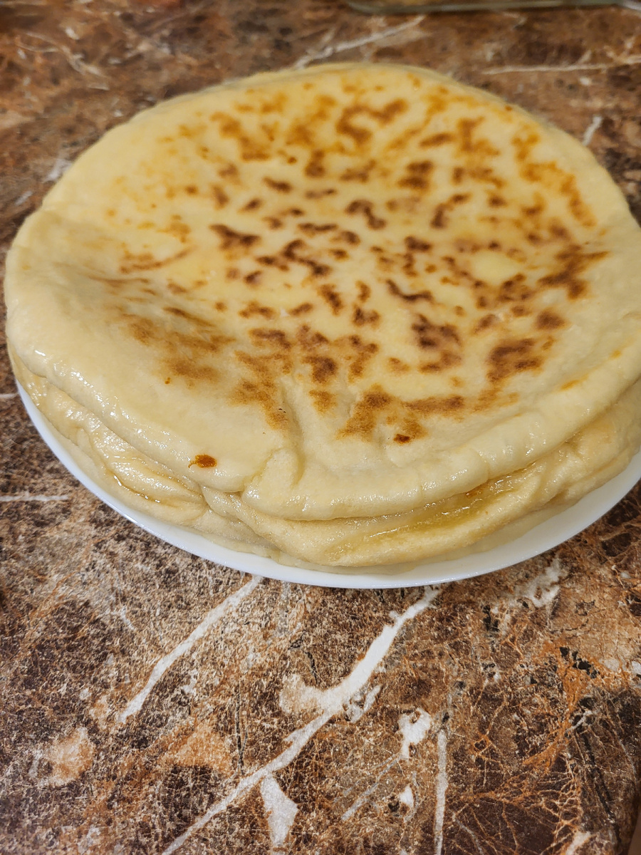 Кладем на сухую сковороду нашу лепешку на средний огонь. Накрываем крышкой и жарим примерно 5-7минут с каждой стороны.