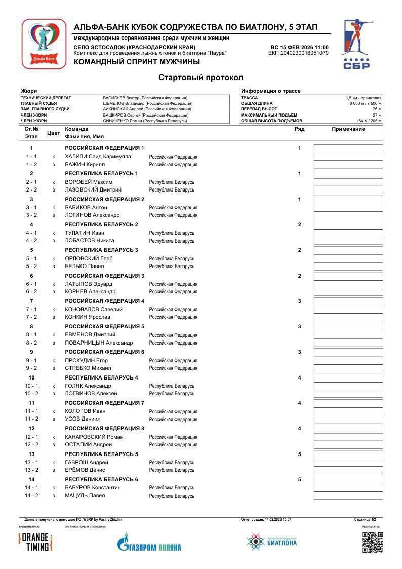V этап Сочи Россия Командный спринт Медали разыграют 26 команд у сударей и 15 у сударынь 15 февраля 11:00 - командный спринт, судари 13:00 - командный спринт, сударыни Спортивное вещание Беларусь 5 ВК Матч ТВ Правила командного спринта. Команда: 2 спортсмена одного пола (М+М или Ж+Ж). Передача эстафеты: После лыжного круга + огневого рубежа - в зоне за штрафным кругом (75 м). Передача - после каждой стрельбы. Огневые рубежи: каждый этап проходит 4 рубежа (2 лежа + 2 стоя). Последовательность: сначала 4 лежа, потом 4 стоя для команды, 1 доп. патрон на стрельбу (макс. 6 — иначе дисквалификация). После последней стрельбы второй спортсмен финиширует. Дистанция: Круг — 1,5 км. Номера: 1-й этап - красный, 2-й - зелёный.