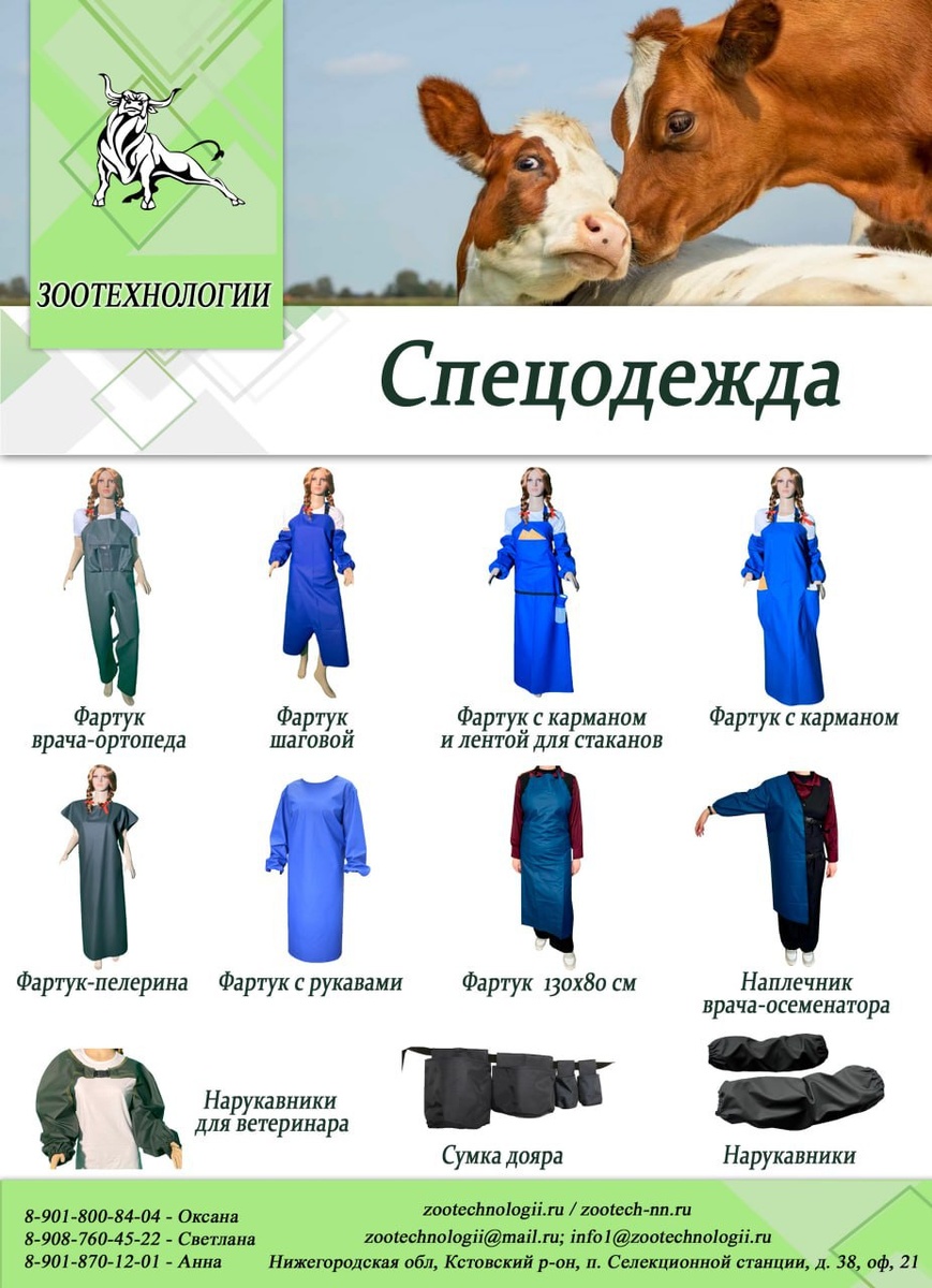 🧼 В продаже спецодежда для дояров, осеменаторов и ветврачей , которые предназначены для защиты работника во время работы на ферме. ➡️ Фартук может иметь карманы для принадлежностей, необходимых при доении, например, для бумаги или полотенец для вымени. Также есть модели, которые защищают от загрязнений в условиях повышенной влажности. ➡️ Нарукавники обеспечивают защиту рук и спецодежды специалиста. Они имеют конусообразный вид, расширяются от кисти к плечу и стягиваются плотной резинкой. ➡️ Наплечник врача-осеменатора — это специализированное средство индивидуальной защиты, предназначенное для ректального исследования, искусственного оплодотворения и гинекологических осмотров животных. Он защищает специалиста от биологических загрязнений, грязи, влаги и других внешних воздействий. ➡️ Сумка дояра — это специализированный аксессуар для хранения инструментов и принадлежностей, используемых при доении животных. Обычно представляет собой поясную сумку с несколькими карманами, которая к
