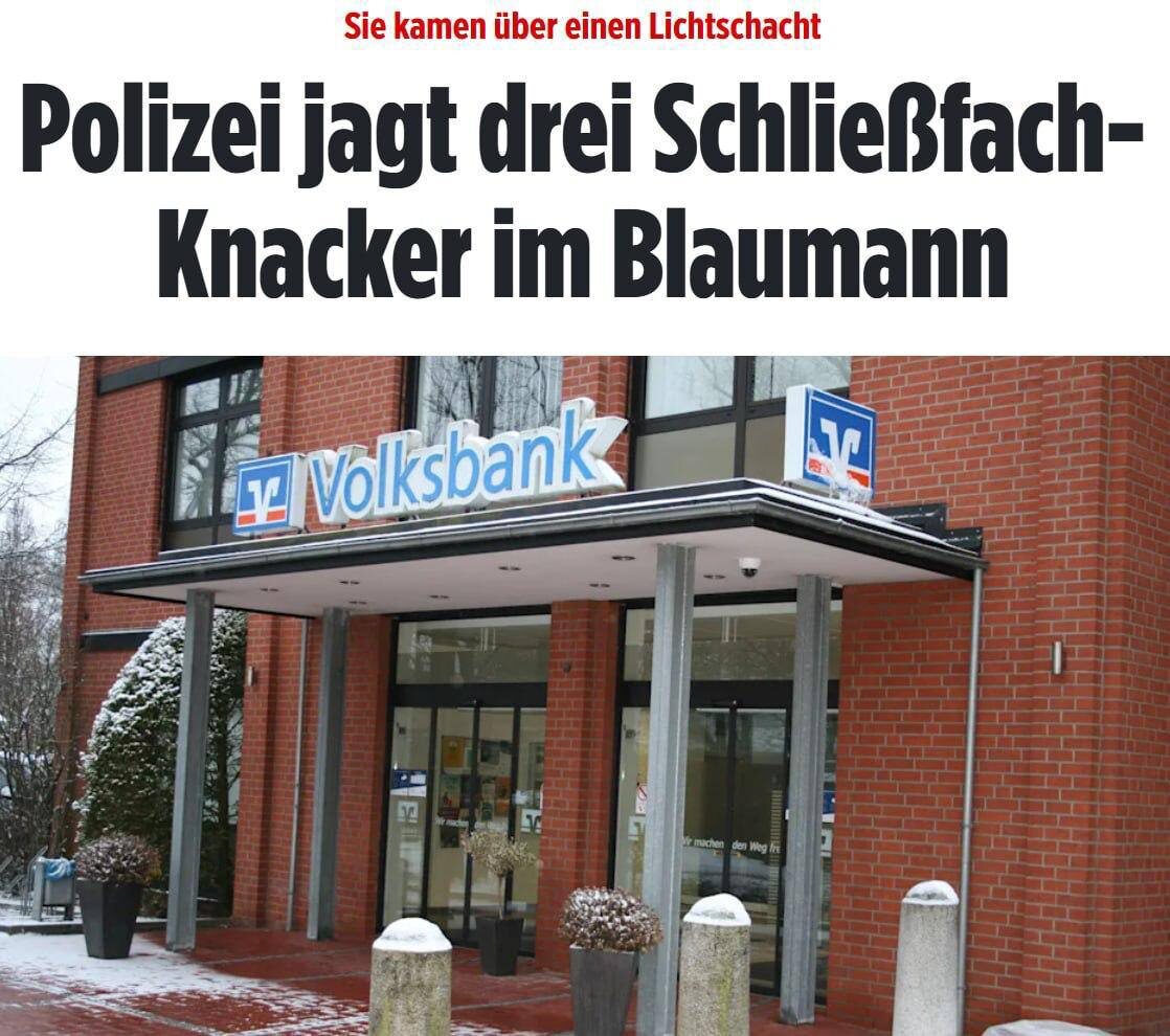 В немецком городе Штур трое неизвестных проникли в хранилище филиала Volksbank, вскрыли 14 банковских ячеек и скрылись. Объем ущерба пока не установлен, полиция ведет розыск. 🔴 Читайте Sputnik Беларусь в MAX