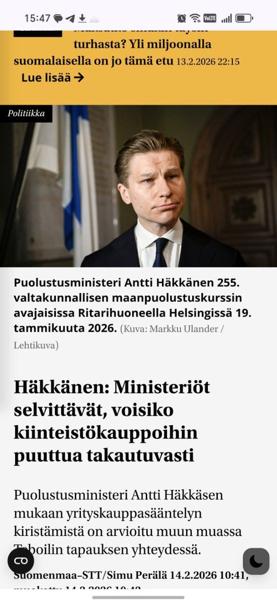 Под предлогом защиты нацбезопасности можно будет вмешиваться в сделки, совершенные в течение последних 20 лет, и конфисковывать имущество приобретëнное в Финляндии россиянами, сообщает издание Suomenmaa со ссылкой на министра обороны Финляндии Хяккянена. 😏 Брекотин. Подписаться 🇷🇺 Брекотин в MAX