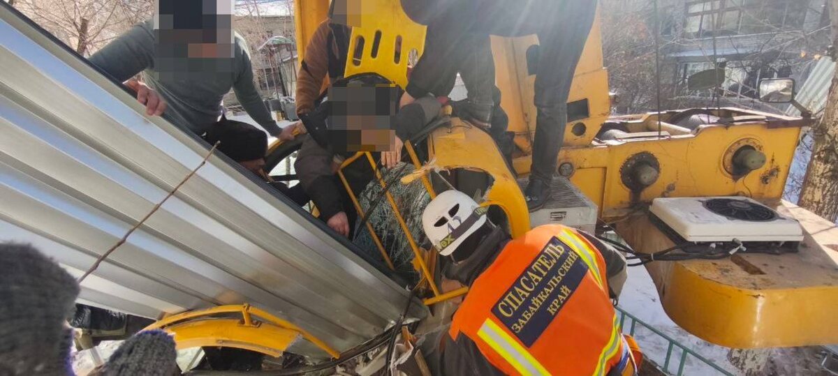 Всё произошло на Хабаровской, 15 — там находится общежитие Читинского техникума отраслевых технологий и бизнеса. Стройматериал поднимали наверх, он сорвался и упал на кабину, зажав машиниста. Специалисты «Забайкалпожспаса» деблокировали пострадавшего. По словам очевидца, у рабочего может быть сломано бедро. Министр здравоохранения региона Оксана Немакина уточнила @chita.ru, что мужчину увезли в городскую больницу №1 в состоянии средней степени тяжести. UPD: Очевидец рассказал, что в 16:00 искорёженного крана на месте уже не было. Часть кровли со стороны ул. Бабушкина сняли, видны небольшие следы строительных работ. Фото: «Забайкалпожспас» 🟦 Быть на связи в MAX