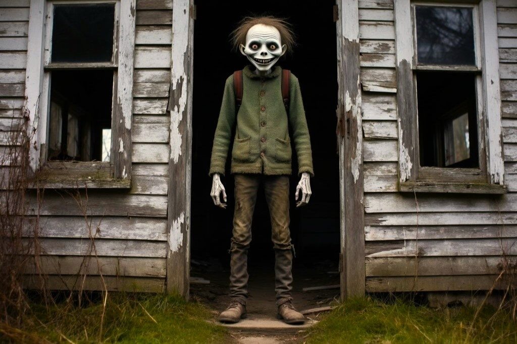 Он повернул голову. На шее — тёмные следы пальцев. А за спиной, в тени дерева, что‑то шевелилось. Что‑то высокое, с длинными руками и головой, наклонённой под неестественным углом.