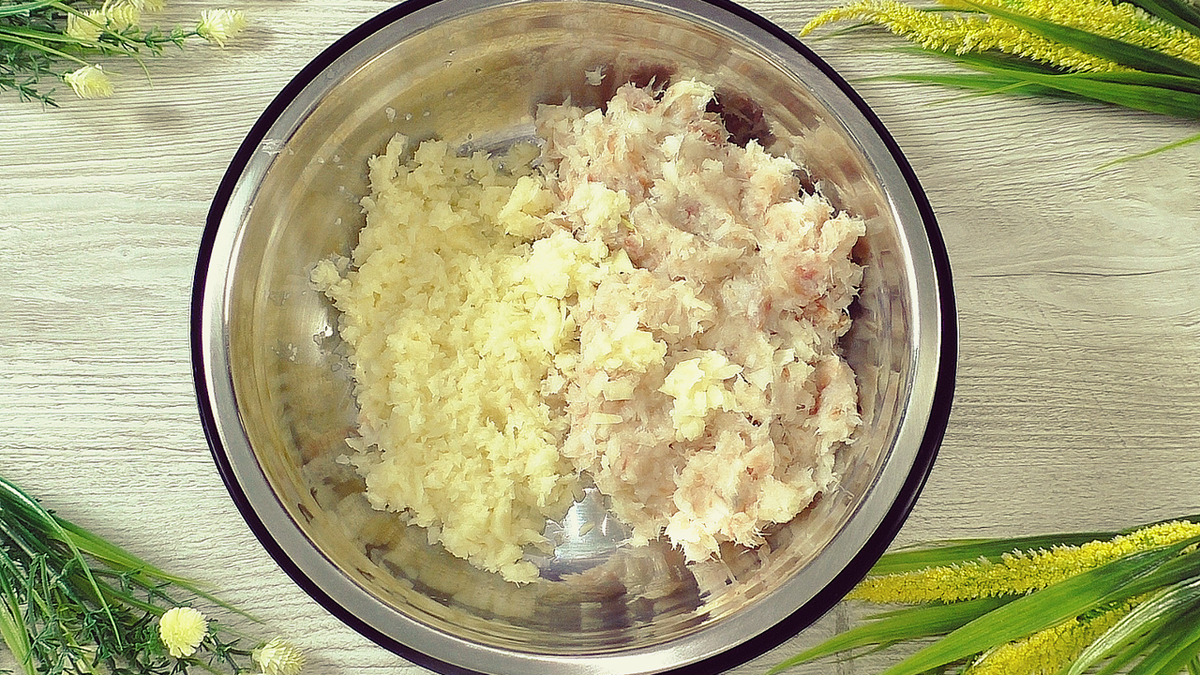 Далее нам нужно измельчить оставшиеся продукты: филе рыбы, лук, картофель. Я это сделаю при помощи блендера, но с этой задачей прекрасно справится мясорубка.