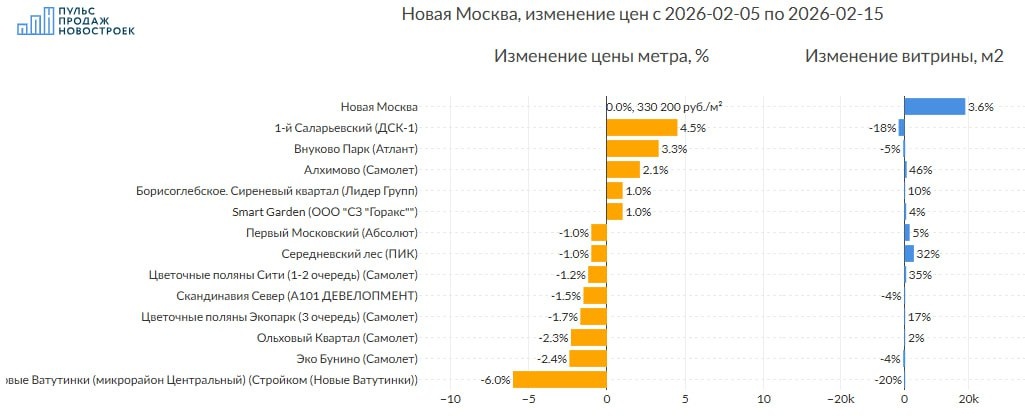💰 Смотрим без премиум и элит классов, лоты до 100м2. 📈Топ изменения цен (подорожало): 1️⃣ЖК "1-й Саларьевский" (ДСК-1) цена метра +4.5%, витрина предложения уменьшилась на -1867м2 2️⃣ЖК "Внуково Парк" (Атлант) цена метра +3.3%, витрина предложения уменьшилась на -375м2 3️⃣ЖК "Алхимово" (Самолет) цена метра +2.1%, объем витрины при этом увеличился на 653м2 🪫Анти топ (подешевело): 1️⃣ЖК "Новые Ватутинки (микрорайон Центральный)" (Стройком (Новые Ватутинки)) -6.0% в цене, витрина предложения уменьшилась на -51м2 2️⃣ЖК "Эко Бунино" (Самолет) -2.4% в цене, витрина предложения уменьшилась на -298м2 3️⃣ЖК "Ольховый Квартал" (Самолет) -2.3% в цене, объем витрины при этом увеличился на 61м2 ☄️Объем предложения жилья в регионе вырос на 3.6% (18987 м2). Всего на рынке доступно 540970 м2 жилых объектов Все изменения в регионе на картинке. ‼️Только для наших подписчиков в телеграмм два сайта - сервис истории цен для поиска выгодных предложений и аналитики по проектам ПИК https://hist.pulspro