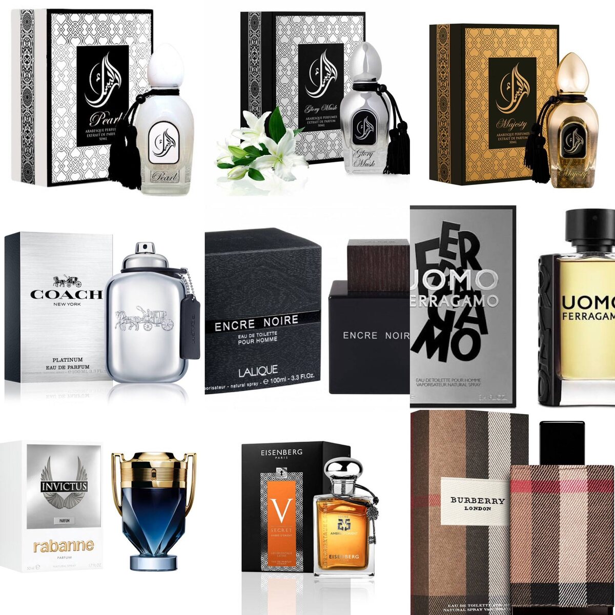Восточная тройка (Pearl / Flory Musk / Majesty) Это про чистоту, мускус, цветы и «я пахну так, будто у меня всё под контролем». Кому подойдёт: тем, кто любит аккуратные, ухоженные, почти «святые» шлейфы. Как держатся: 6–8 часов, сидят близко к коже, но долго. Ассоциации: белая рубашка, порядок в голове и человек, который выглядит невинно, но знает слишком много. Coach Platinum Ноты: ананас, ваниль, специи, древесные ноты. Кому подойдёт: тем, кто хочет пахнуть «чисто, дорого и безопасно для нервной системы окружающих». Как держится: 6–7 часов, аккуратный, без истерик. Ассоциации: свежая стрижка, кроссовки за ползарплаты и ощущение, что жизнь вроде под контролем (пока). Lalique Encre Noire Ноты: ветивер, кипарис, древесные ноты. Кому подойдёт: интровертам, философам и тем, кто любит «мрачно, но красиво». Как держится: 7–9 часов, сидит строго и без улыбок. Ассоциации: чёрное пальто, дождь и мысли, которые лучше не озвучивать вслух. Salvatore Ferragamo Uomo Ноты: кофе, ваниль, тирамису,