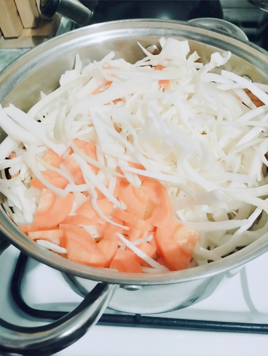 В кастрюле с толстым дном в небольшом количестве масла спассеровать лук и морковь. Добавить нашинкованную капусту и потушить до её мягкости. Залить всё водой, посолить и после закипания проварить минут 15.