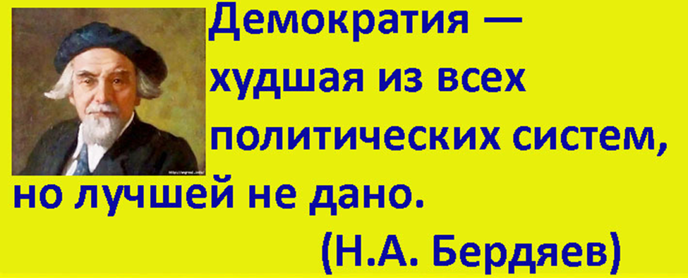 И в современной России – ну просто расцвет демократии и свободы народного волеизъявления. Президент РФ избирается путем прямого общенародного голосования на альтернативной основе. В Государственной Думе на постоянной основе ежедневно трудятся сотни народных избранников, которые представляют целых пять партий. Наличие государственной идеологии запрещено Конституцией. В печати и особенно в интернете, просто вакханалия свободы. В общем полное торжество демократии.