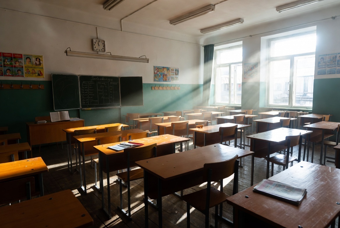 Все парты пустые. Ни одного ребёнка. Ни одного портфеля. Ни одной тетрадки на столах.