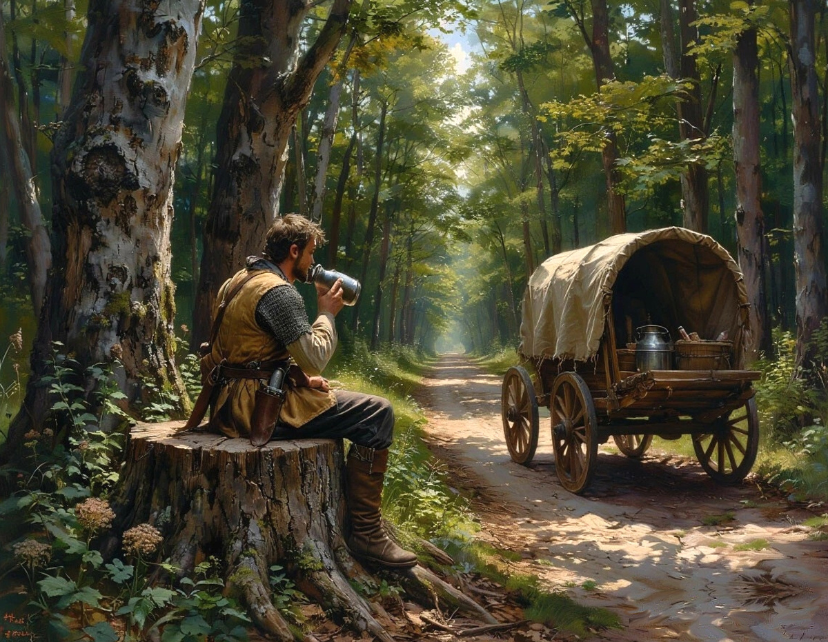 Не прошло и пятнадцати минут, как их отряд уже двигался дальше. Но это оказался не последний сюрприз на сегодня. Сразу за прибрежными зарослями начинался лес, в котором они нашли нечто полезное. Видимо, рассчитывая на быструю победу, разбойники оставили там повозку с награбленным добром. Откуда они её взяли было неизвестно, но поживиться там было чем. В повозке оказались мешки с зерном, половина разделанной туши лесного горбача, а ещё тюки дорогих тканей и пара ящиков с разнообразным добром. В этих ящиках, среди разной мелочёвки, нашлись припрятанные мешочки с парой сотен имперских серебряных саларнов. Возможно их спрятали там те, кого ограбили разбойники. Но теперь это было неважно.