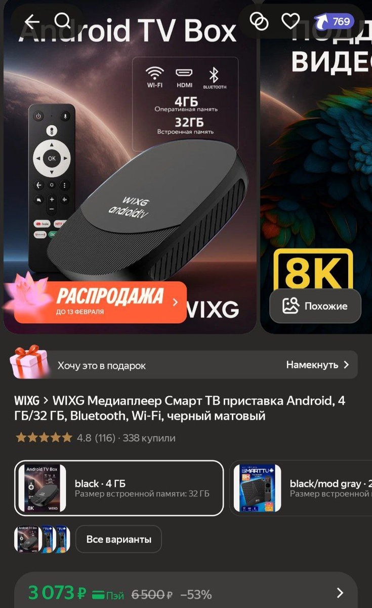 WIXG Медиаплеер Смарт ТВ приставка Android, 4 ГБ/32 ГБ, Bluetooth, Wi-Fi, черный матовый