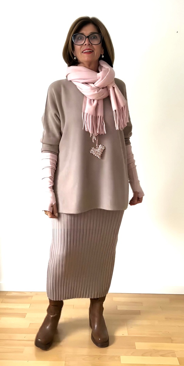 Вопреки распространенному мнению, ношение вещей из трикотажа не превращает женщину в бабушку. Качественный трикотаж легко можно использовать для создания стильных и современных образов, в которых дама зрелых лет будет выглядеть свежей, молодой и эффектной. 1. Светло-серая прямая трикотажная юбка-миди – вещь, которую можно гармонично дополнить такого же оттенка джемпером свободного кроя и лаконичного дизайна. Оттенить и сделать более интересной серую гамму наряда помогут нежно-розовые детали – перчатки-митенки и шарф, причудливым узлом повязанный на шее, а также темно-коричневые ботинки на толстой подошве. 2. Минималистичный свитер достаточно темного бирюзового оттенка не будет выглядеть как «бабушкин», если надеть его в ансамбле с того же оттенка прямыми кожаными брюками, подвернутыми на щиколотках, а также набросить на него шарф светлого серо-голубого оттенка. Изюминкой образа станет трендовое сочетание цветов – дополнение бирюзового наряда нотками винного оттенка – небольшой сумочкой
