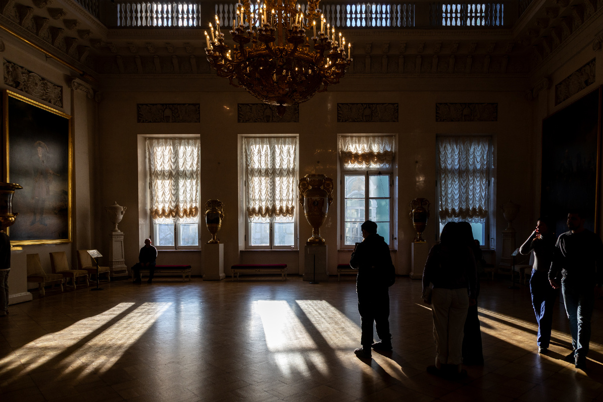 Особенно красивым оказывается практически любой зал Зимнего дворца с большими окнами в солнечный день. Если оказались в такой ситуации - ловите солнечные лучи.